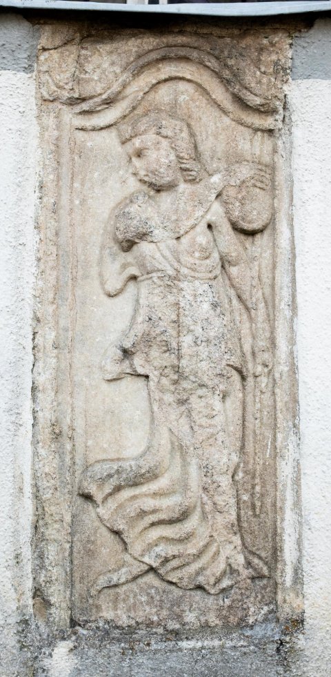- Mythische Figur, Musikinstrument: in Bogennische tanzende Mänade in langem gegürteten Gewand, linke Brust entblößt, in der Rechten Tympanon, in der Linken Stab.