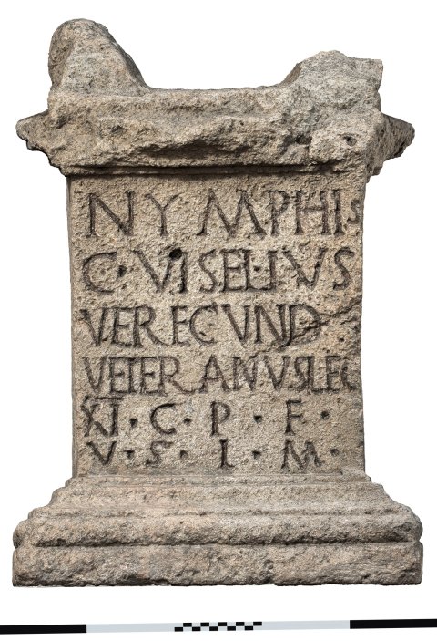- Nymphis / C(aius) Viselius / Verecundu[s] / veteranus leg(ionis) / XI C(laudiae) p(iae) f(idelis) / v(otum) s(olvit) l(ibens) m(erito)