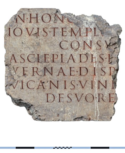 - [I]n hono[rem domus divin(ae)] / Iovis templu[m incendio] / consu[mptum] / Asclepiades I[---] / vernae disp(ensator) [vicarius] / vicanis Vind[onissensibus] / de suo re[stituit]