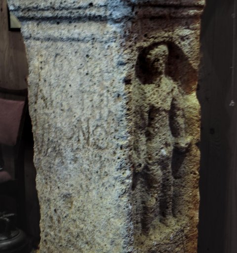 - auf den Nebenseiten in Bogennischen stehende Figuren (Nemesis mit Helm ?, männliche Gottheit ?)