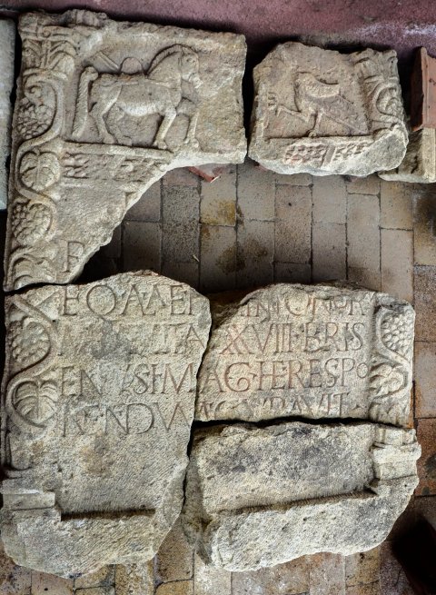 - Zwischenbild mit gezäumtem Pferd und Pfau (?), darunter Blattfries; Schriftfeld und Zwischenbild zwischen Säulen mit Weinranken.