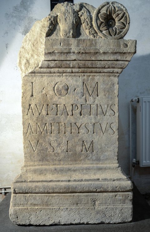 - I(ovi) o(ptimo) m(aximo) / Aul(us) Tapetius / Amethystus / v(otum) s(olvit) l(ibens) m(erito)