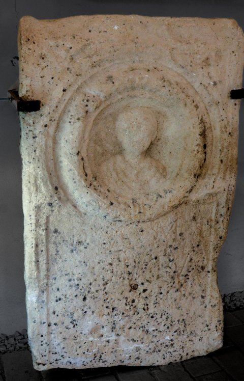 Im oberen, rechteckiges Feld mit einfachen Rahmen im Zentrum eine runde Porträtnische mit Büste eines Mannes in tunica und sagum. Rundum Blätterkranz und Arkade. Obere Zwickel mit Palmetten verziert.