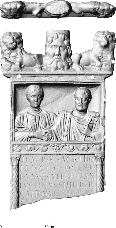 - D(is) M(anibus) p(ositum) S(exto) Sacretio / Prisco Q(uirina) Sol(va) genero / p(ientissimo) an(norum) XXVI et Capit(oniae) Iuli(a)e fil(iae) p(ientissimae) an(norum) XX / Iustinus Similis et / Capitonia Ingenuina / con(iuges) [---] / [---