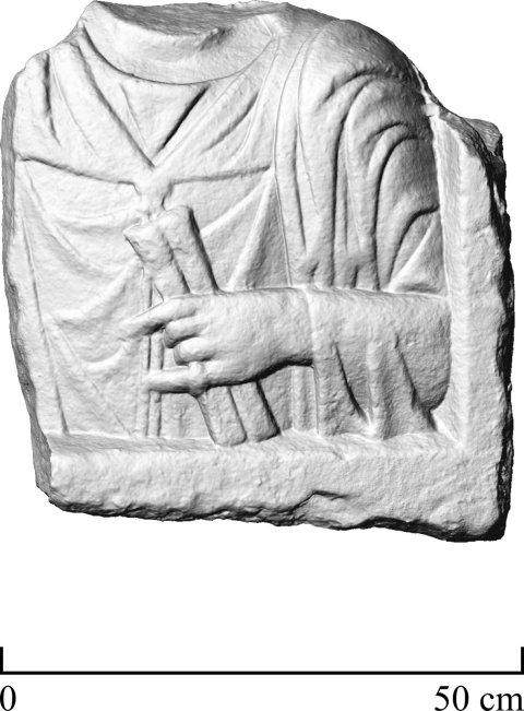 - Ehepaar (?). Rechts Brustbild eines Mannes:Tunica, vorn mit Fibel geschlossene paenula, Mantel über der linken Schulter, in der Linken Rolle (volumen), Fingerring. Links weitere Person ?