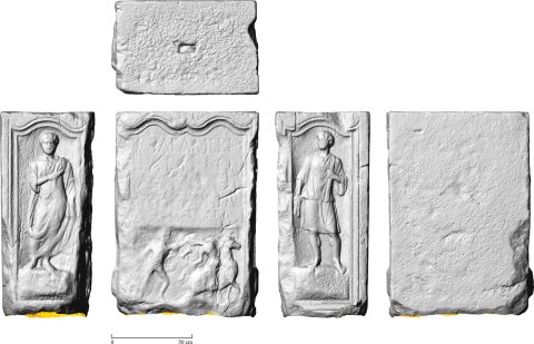 Auf der linken Nebenseite Frau (Dienerin ?): in Bogennische auf Podest stehende Figur in langer Tunica und über linke Schulter und Arm geführtem langen Mantel. Auf der rechten Nebenseite Diener: in Bogennische auf Podest Mann in kurzer Tunica, in der Rechten Tuch (?), über der linken Schulter mappa. - Inschrift