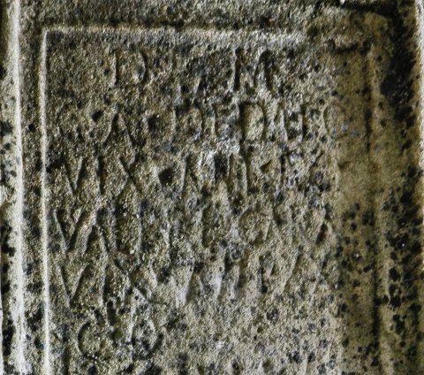 - D(is) M(anibus) / C(aio) A(urelio?) D(a)edalo / vix(it) an(n)i(s) LX / Valeri(a) Cara / vix(it) an(n)i(s) XXXV / c(oniugi?) o(ptimo?) / A(urelia?) Tetula vix(it) / an(n)i(s) L A(urelia?) Augusta / vix(it) an(n)is XXX / C(aius) A(urelius?) Carus / C(aius) A(urelius?) Valerianus / veteranus / pare[n]tibus / sororibus / fecerunt / Fla(via) Crispina Vetilla // Maxima Butes eorum