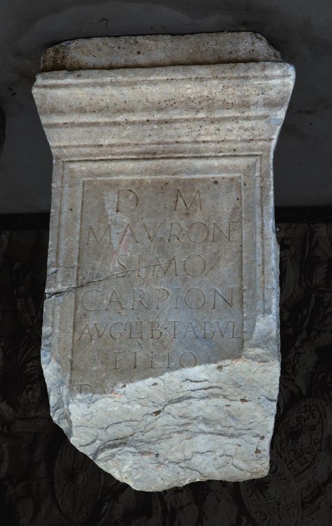 - D(is) M(anibus) / M(arco) Aur(elio) One/simo / Carpion / Aug(usti) lib(ertus) tabul(arius) / filio / dul[cissimo p(osuit)?]