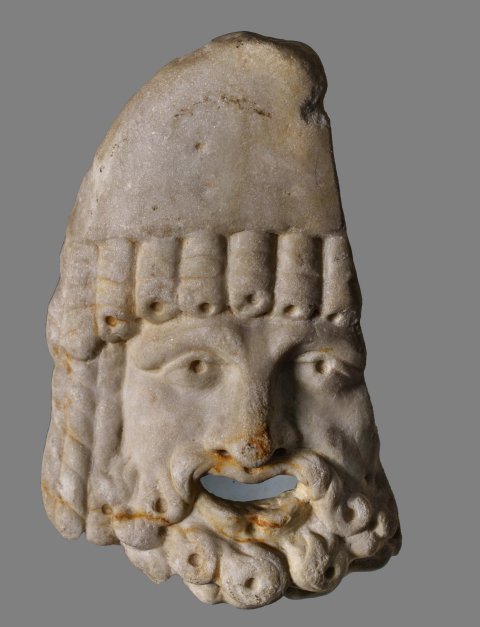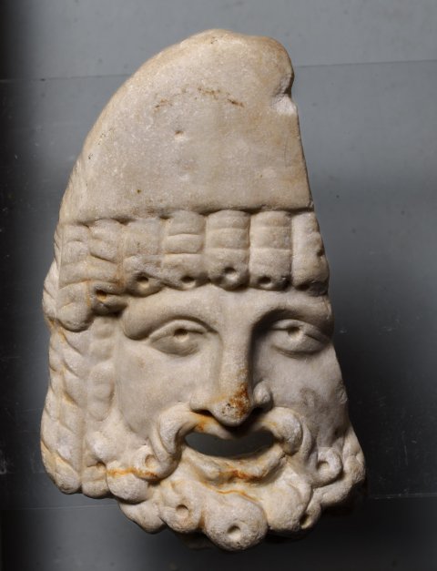- Maske eines bärtigen Mannes mit Korkzieherlocken über der Stirn und spitzer Mütze.