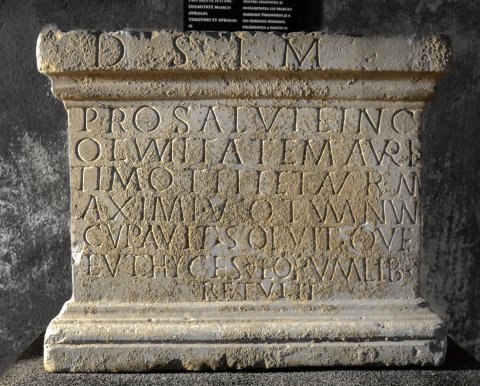 - D(eo) S(oli) I(nvicto) M(ithrae) // pro salute (et) inc/otlumitate (!) M(arci) Aure(lii) / Timotei et Aur(elii) M/aximi votum nun/cupavit solvit que / Euthyces eorum lib(ertus) / retulit