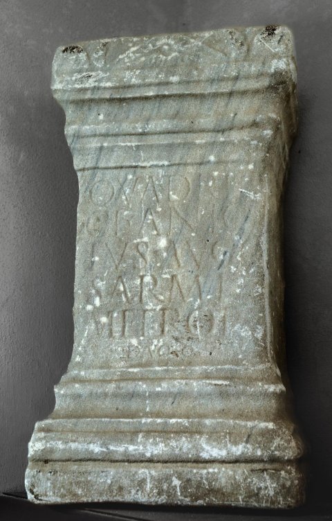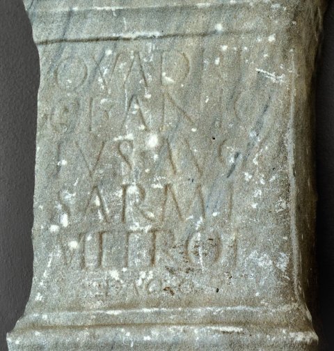 - Quadrib(is!) / Cl(audius) Anic[e]/tus Aug(ustalis) c(oloniae) / Sarmiz(egetusae) / metrop(olis) / ex voto