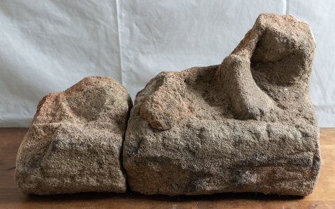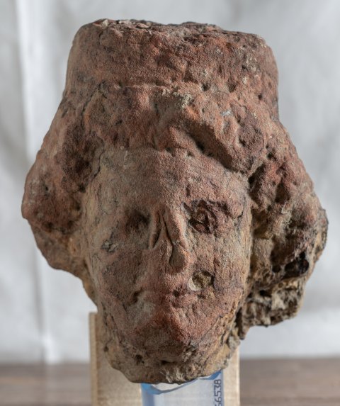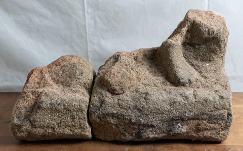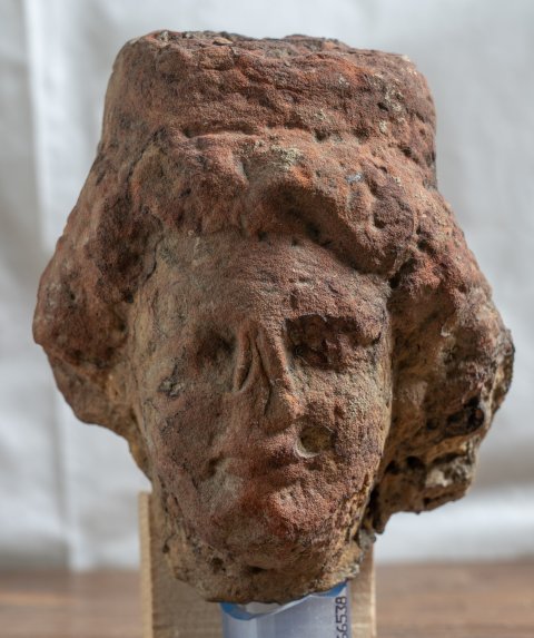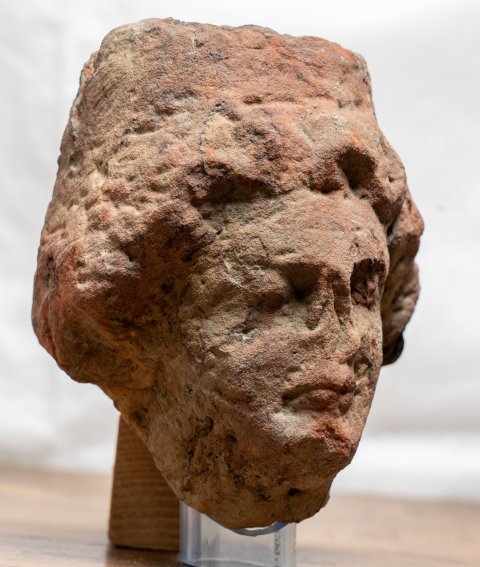 - stark bestoßener Kopf, 2 anpassende Fragmente des Sockels