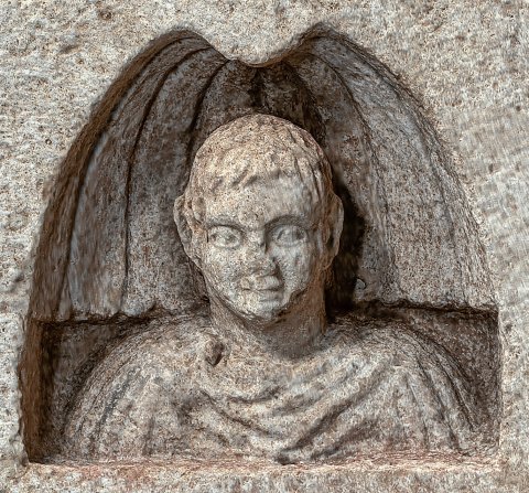 - Stele mit horizontalem Abschluss. Oben Rechteckfeld mit Akanthuskelch und Spiralranken mit Blüten. Darunter Muschelbaldachn, darin bekleidete Büste eines Knaben. Darunter gerahmtes Schriftfeld.