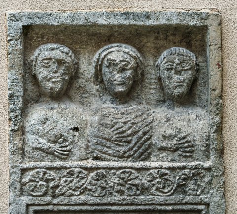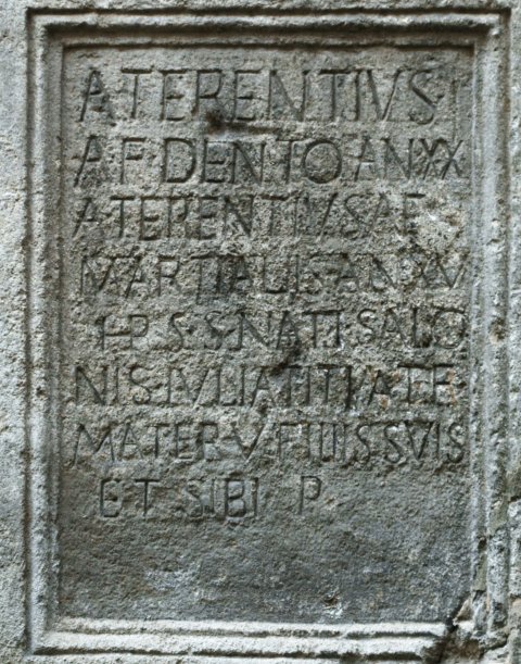 - A(ulus) Terentius / A(uli) f(ilius) Dento an(norum) XX / A(ulus) Terentius A(uli) f(ilius) / Martialiis an(norum) XXV / h(ic) s(iti) s(unt) nati Salo/nis Iulia Titia T(iti) f(ilia) / mater v(ivae) filiis suis / et sibi p(osuit)