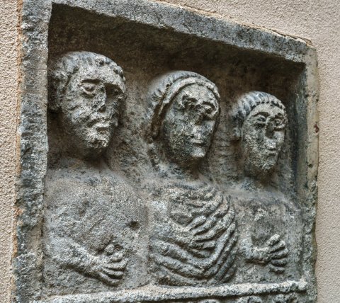 Im Hauptbild in Rechtecknische drei Brustbilder einer Familie. Links Mann: bartlos, kurze Locken. In der Mitte Frau: Schleier. Rechts Mann: bartlos, kurzgesträhntes Haar.