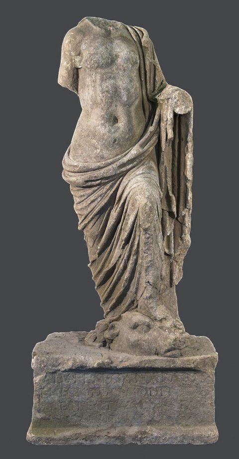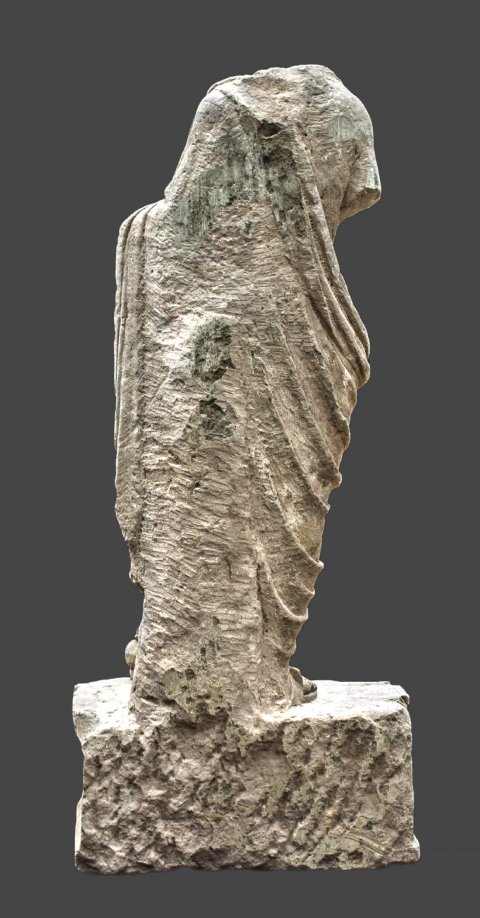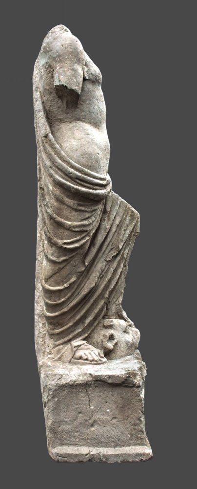 - Kopf, rechter Unterarm u. linke Hand abgebr., bestoßen, Rückseite flüchtig ausgearbeitet