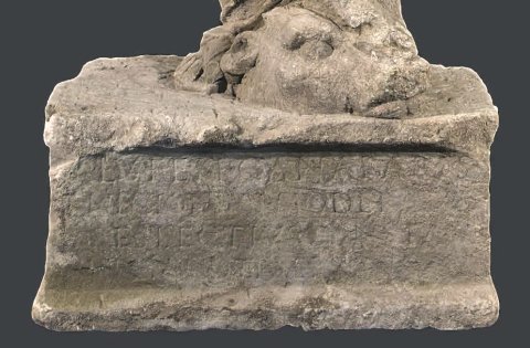 - Mythische Figur: stehende Salus, Mantel um linken Arm, Rücken und Beine, auf der linken Schulter Schlange, linker Fuß auf Rinderkopf. Kubischer Sockel mit Inschrift.