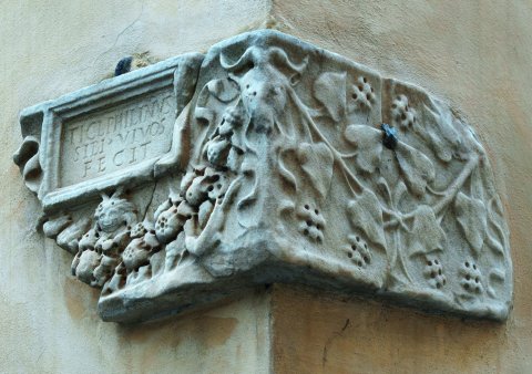 - Auf der Vorderseite gerahmte Schrifttafel, darunter an Tierköpfen hängende Girlande mit Panskopf; auf der rechten Seite Efeuranken.