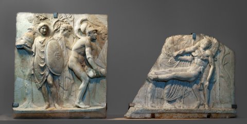 - Mythos (Meleager ?): Transport eines nackten Leichnams. Erhalten ist links ein Krieger mit Helm, der die Füße des Toten trägt, im Hintergrund Kopf eines älteren Mannes. Auf dem rechts anschließenden Fragment hält ein Mann in kurzem Gewand den Toten unter den Achseln, im Hintergrund Mann im Mantel, auf einen Stab gestützt und Bein eines weiteren Mannes. Rechts Säule (?) und Baum.