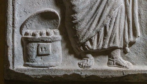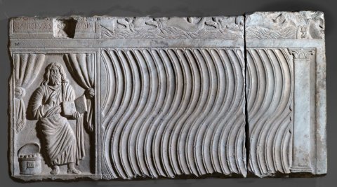 Frontseite eines Riefelsarkophages. Oben horizontal abgeteiltin der Mitte Schriftfeld (tabula ansata), rechts anschließend Bildfeld mit Wellen und Fischen, rechts am Eck Maskenakroter.