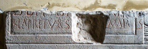 Unter der Inschrift Bildfeld mit stehender bärtiger Christusfigur in Ärmeltunica, Toga und Sandalen, in der Linken aufgeschlagenes Buch, neben dem rechten Fuß runder Behälter mit Schriftrollen, seitlich geraffte Draperien. Anschließend Riefeln, ganz rechts glatte Säule und Rahmenleiste. - Inschrift