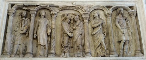 - Mythische Figuren: Säulensarkophag mit Arkaden, in der mittleren von einem anderen Sarkophag stammende Hochzeitsszene mit darüber schwebenden Eroten. Links davon zwei Interkolumnien mit je einer Muse; in den rechten Interkolumnien eine weibliche Figur, Ergänzung des 16./17. Jhs., und ein Mann in kurzer Tunica und Stiefeln, tlw. antik, aber nicht zugehörig.