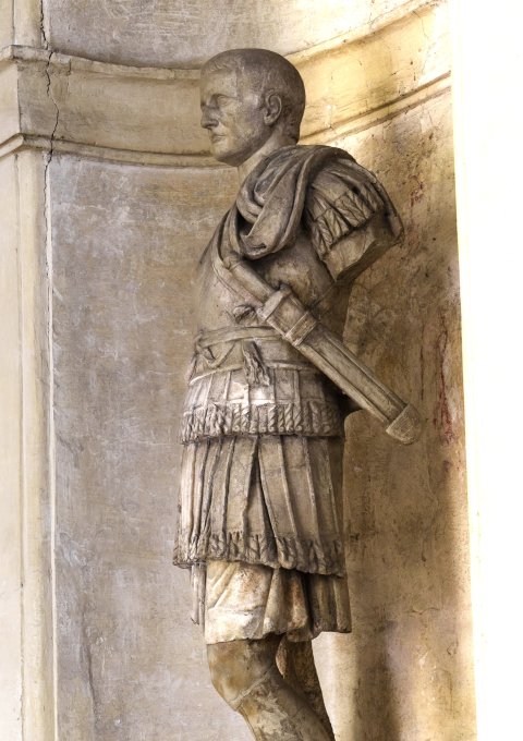 - Überlebensgroße Statue eines Feldherrn (Kaiser) im Brustpanzer mit Feldherrnbinde, Schwertgurt und Schwert an seiner linken Seite.