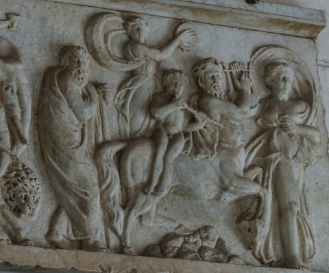 Mythische Figuren: links von zwei Elefanten gezogener Wagen, auf dem Dionysos im langen gegürteten Gewand steht (weibliche Formen, auf der Stirn Mondsichel !); geflügelte Victoria hält einen Kranz über ihn; auf den Elefanten reiten nackte Jünglinge (Satyrn), unten Panther und Löwe. In der rechten Hälfte des Reliefs bärtiger Mann im Mantel, dann Kentaur mit Kithara, auf seinem Rücken flöteblasender Knabe, im Hintergrund Mänade mit Tympanon; ganz rechts tanzende Mänade.