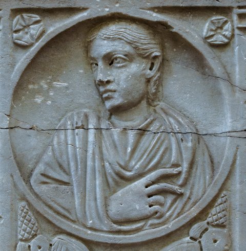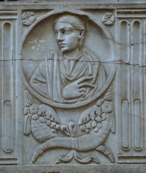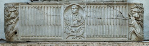 - Wannensarkophag, Frontseite kanneliert, in der Mitte Medaillon mit Büste einer Frau im Mantel, darunter gekreuzte Füllhörner. An den Schmalseiten Löwe über Beutetier (Hirsch, Pferd).