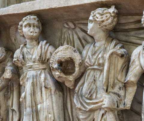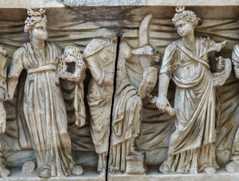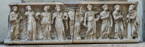 - Mythische Figuren: auf der Frontseite die neun Musen mit Attributen, im Hintergrund Draperie. Auf den Schmalseiten sitzender Philosoph.
