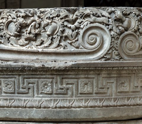 Profilierter Sockel mit Flechtband und Akanthusblattfries.