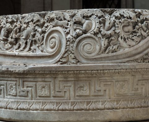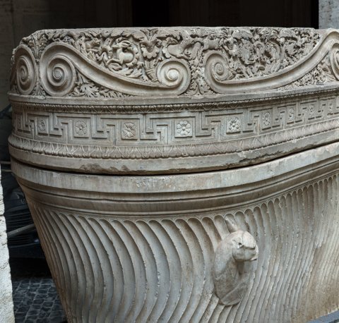 Wannensarkophag mit umlaufenden Riefeln, auf der Vorderseite links Panther-, rechts Pferdeprotome. Dachförmiger Deckel, auf Vorder- und Schmalseiten vorgeblendeter Fries mit Kyma und Mäanderband mit Rosetten, darüber Spiralhaken vor Akanthusranken mit Tieren.