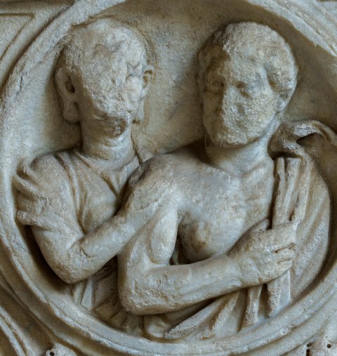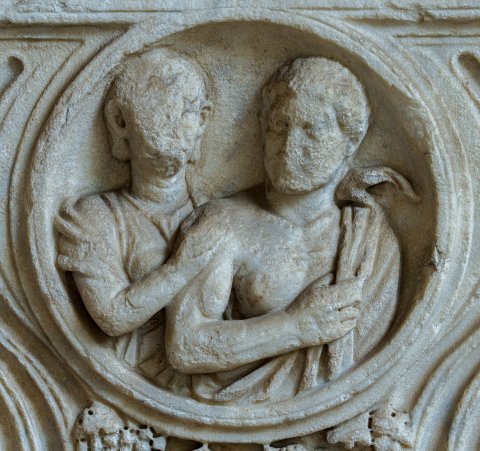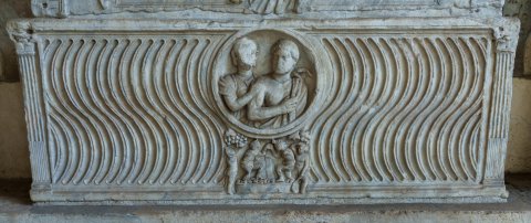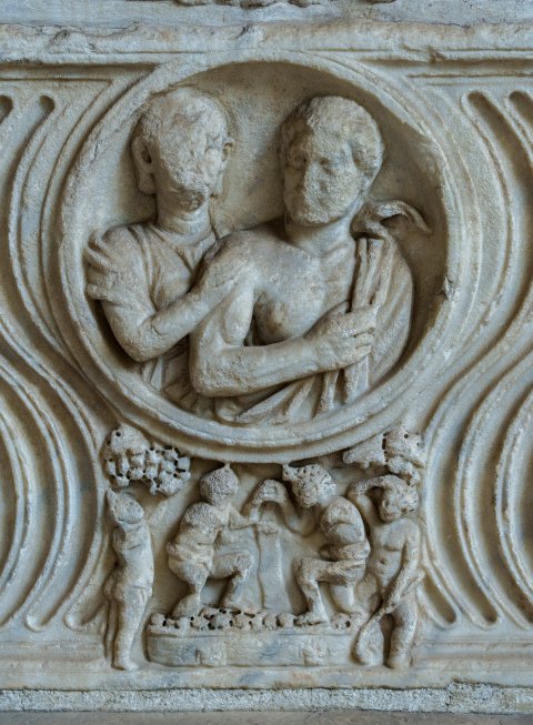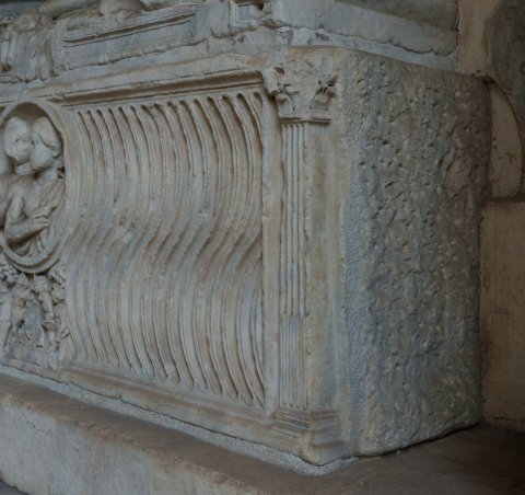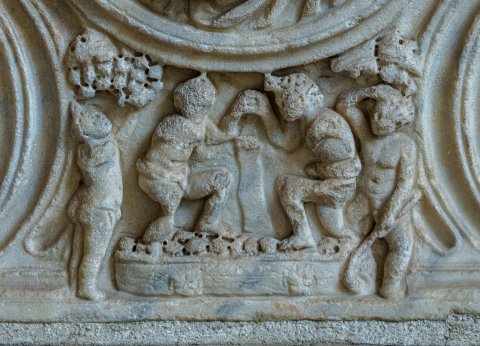 - Riefelsarkophag, nur Frontseite ausgearbeitet. In der Mitte Medaillon mit zwei Büsten (Ehepaar), bärtiger Mann mit Mantel und nackter Brust, Frau mit Scheitelzopffrisur. Unter dem Medaillon zwei Knaben beim Stampfen von Trauben, links Traubenpflücker, rechts Knabe mit Pedum. An den Ecken kannelierte Pilaster.