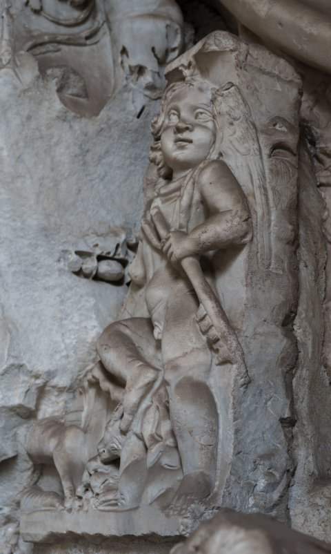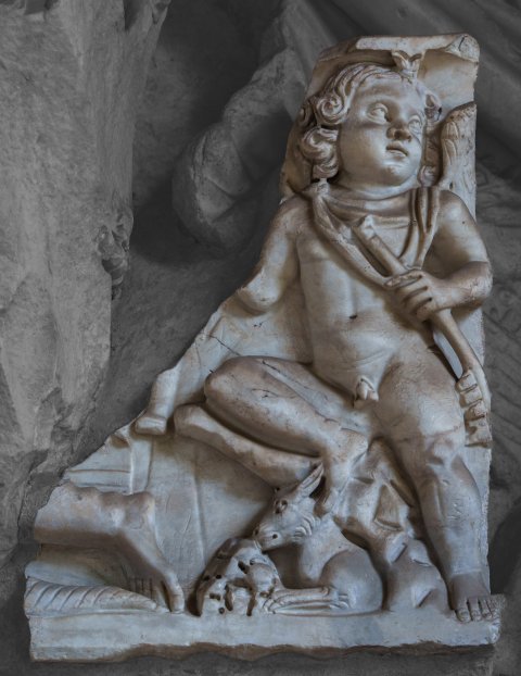 - Auf Felsgrund sitzender kindlicher Erot mit Flöte (?) in der linken Hand, zu seinen Füße liegende Ziege, links davon nach links laufendes Tier.