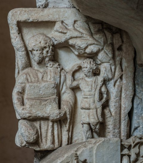 - Rechts Baum, darunter stehende kleine Figur in kurzer gegürteter Tunica, in der Linken Bogen (?), rechte Hand zur Stirn erhoben. Links anschließend größerformatige Frau in Ärmelkleid und Mantel, in beiden Händen geschlossenes Kästchen. Votivrelief ?