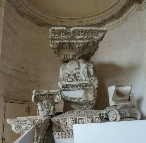 - Eckblock eines Konsolgesimses; auf dem Geison alternierend zwei Delphine um Dreizack und Akanthuskelche, darunter Pfeifenstab, Konsolen mit Akanthusblatt, dazwischen Kassette mit Rosette, unten Eierstab.