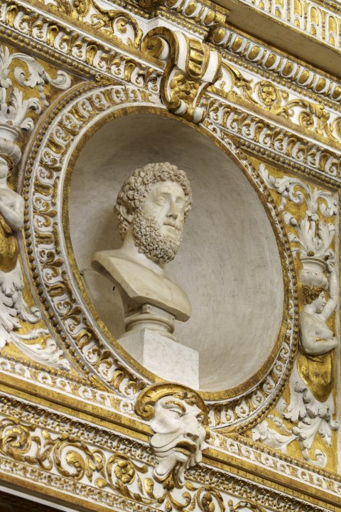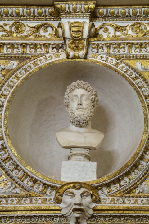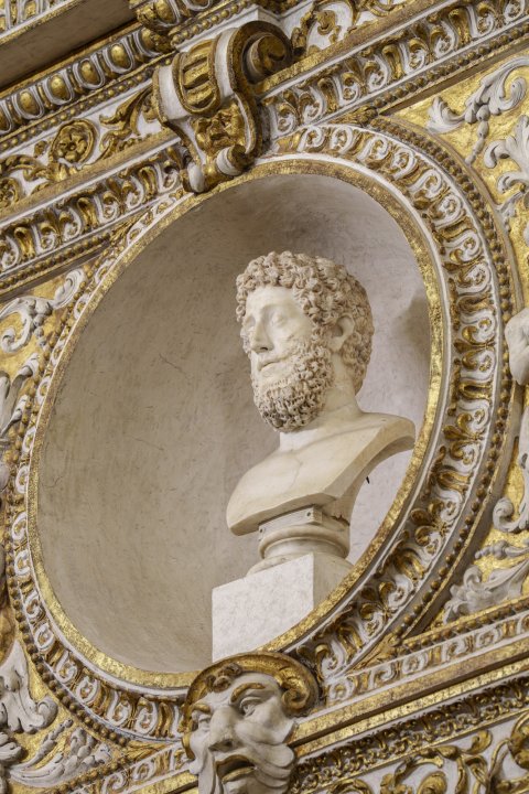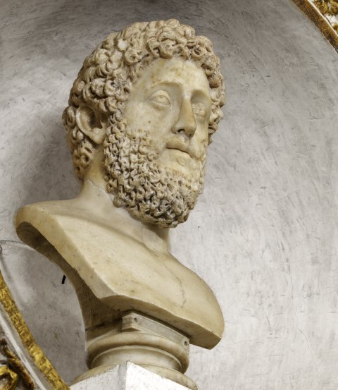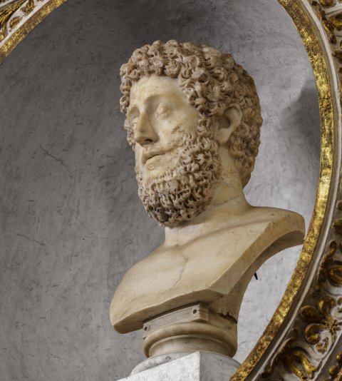- unbekleidete Porträtbüste eines Mannes mit lockigem Haar und Bart