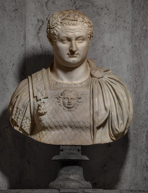 - Porträt eines bartlosen Mannes mit Kranz, Schuppenpanzer mit Gorgoneion, Schulterlasche mit Löwenkopf, Mantel mit Scheibenfibel auf der linken Schulter. Arbeit des 16./17.Jhs.