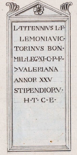 - L(ucius) Titennius L(uci) f(ilius) / Lemonia Vic/torinus Bono(nia) / mil(es) leg(ionis) XI C(laudiae) P(iae) F(idelis) / |(centuria) Valeriana / annor(um) XXV / stipendior(um) V / h(eres) t(estamento) f(aciendum) c(uravit)