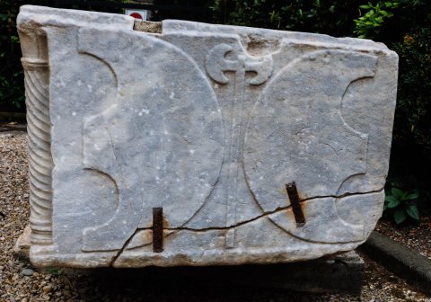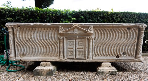 Sarkophag mit Riefeln auf der Vorderseite, an den Ecken Säulen mit Spiralkannelur, in der Mitte zwischen Säulen Flügeltür mit vier Feldern mit Schlüssel, Schloss und Türklopfern; oben Giebel mit Rundschild und Palmettenakroteren.