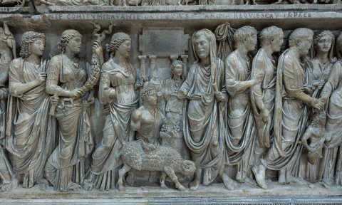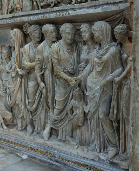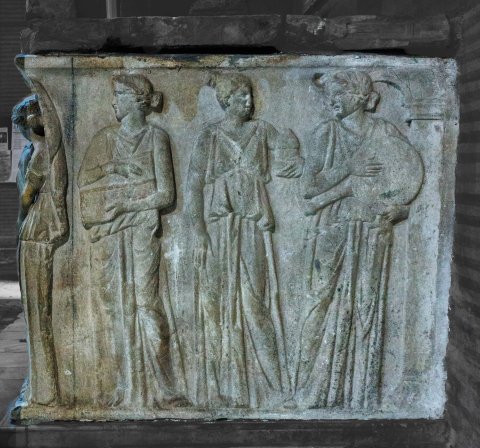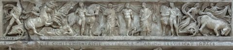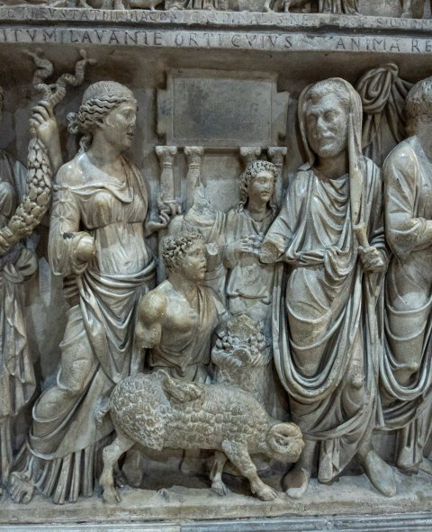 Linke Schmalseite. Opferdiener mit Schwein, Hore mit Girlande, Jüngling in kurzer Tunica mit Schale, darin Geschenke. - Kommentar