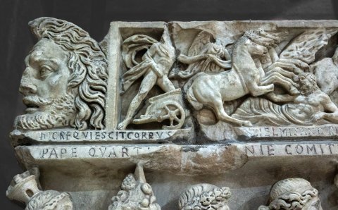 - Inschrift von 1256: HIC REQUIESCIT CORPUS DOMMINI GUILIELMI SANCTI EUSTATHII DIACONI CARDINALIS NEPOTIS QUONDAM FELICIS RECORDATIONIS DNI INNOCENTII / PAPE QUARTI EX PROGENIE COMITUM LAVANIE ORTI CUIUS ANIMA REQUIESCAT IN PACE