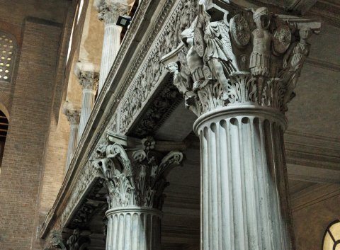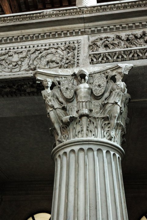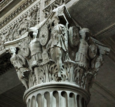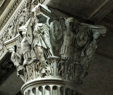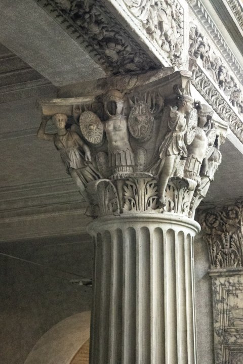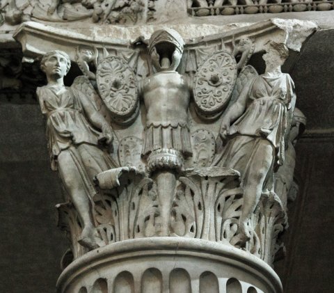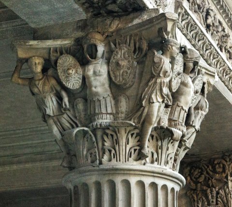 - Korinthisches Kapitell : über dem Akanthusblattkranz Tropaia aus Helm, Panzer, ovalen Schilden und Speeren; an Stelle der Voluten Victorien, die den Abacus stützen.