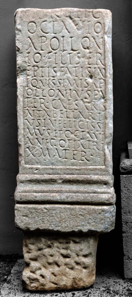 - ---]oro et C(aio) / Octavio / Apollon/io fili(i)s er/eptis fatis in/iquissimis Ap/ollonius pa/ter Caesaris / n(ostri) tabellari/us infelicissi/mus et Octavi/a negotiatri/x mater