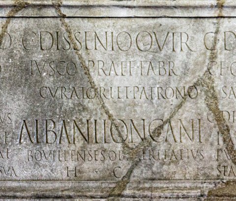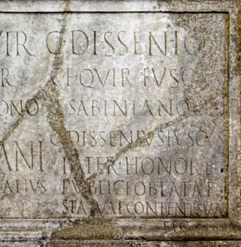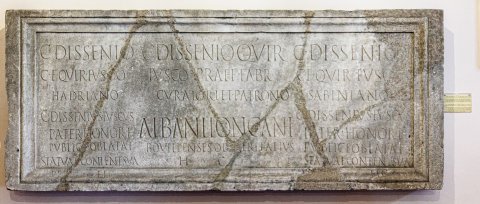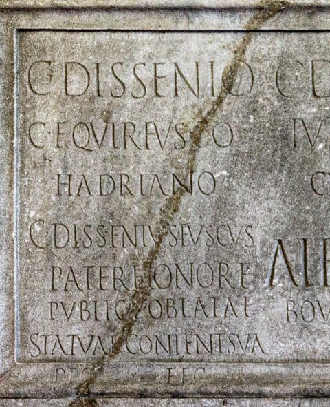 - C(aio) Dissenio / C(ai) f(ilio) Quir(ina) Fusco / Hadriano / C(aius) Dissenius Fuscus / pater honore / publice oblatae / statuae content(us) sua / pec(unia) fec(it) // C(aio) Dissenio Quir(ina) / Fusco praef(ecto) fabr(um) / curatori et patrono / Albani Longani / Bovillensis ob merita eius / h(onoris) c(ausa) // C(aio) Dissenio / C(ai) f(ilio) Quir(ina) Fusc[o] / Sabiniano / C(aius) Dissenius Fuscus / pater honore / publice oblatae / statuae content(us) sua / pec(unia) fec(it)