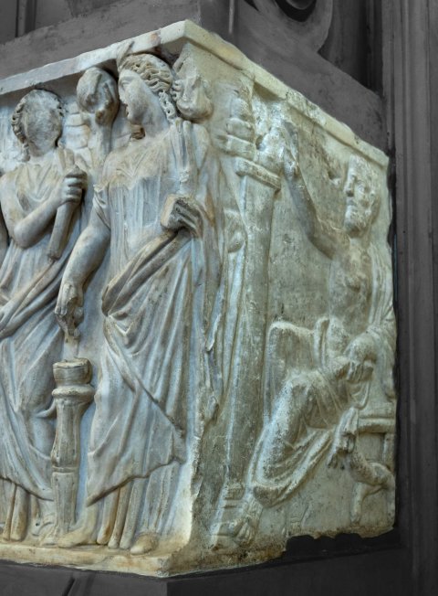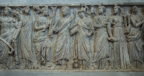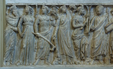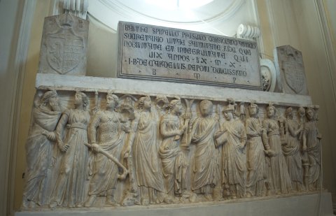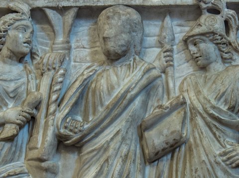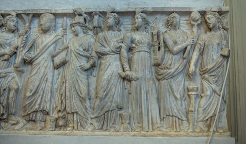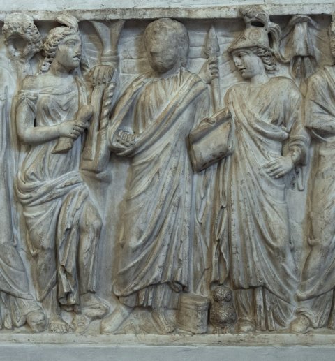 Mythische Figuren. Musen mit Attributen, in der Mitte stehender Togatus mit volumen in der linken Hand, zu seiner Linken Minerva mit Helm und Lanze, zu ihren Füßen Eule.