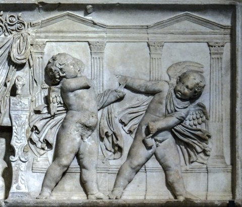 - Im Zentrum mit einem Tuch bedeckter leerer Thron mit Fußschemel, auf diesem Globus. Seitlich je zwei Eroten, links mit Sichel, rechts mit Szepter des Saturn. Im Hintergrund Architektur (Podest, darauf kannelierte Pfeiler, die Gebälk und vier Giebel tragen).