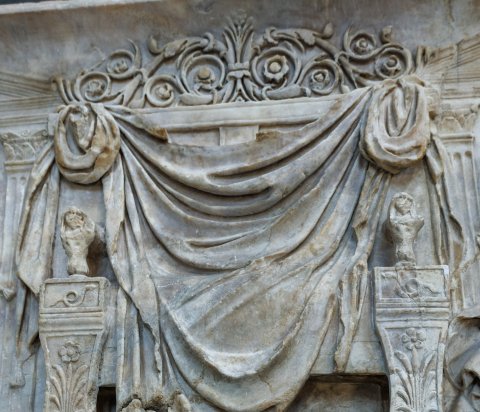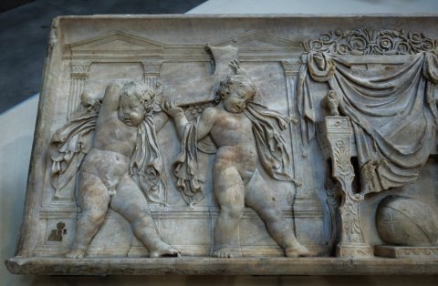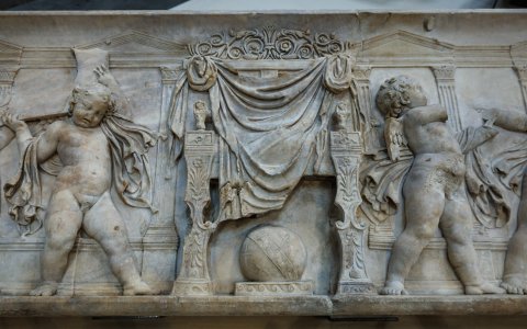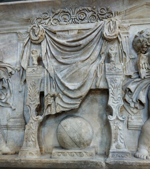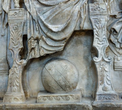 - Im Zentrum mit einem Tuch bedeckter leerer Thron mit Fußschemel, auf diesem Globus. Seitlich je zwei Eroten, links mit Sichel, rechts mit Szepter des Saturn. Im Hintergrund Architektur (Podest, darauf kannelierte Pfeiler, die Gebälk und vier Giebel tragen).