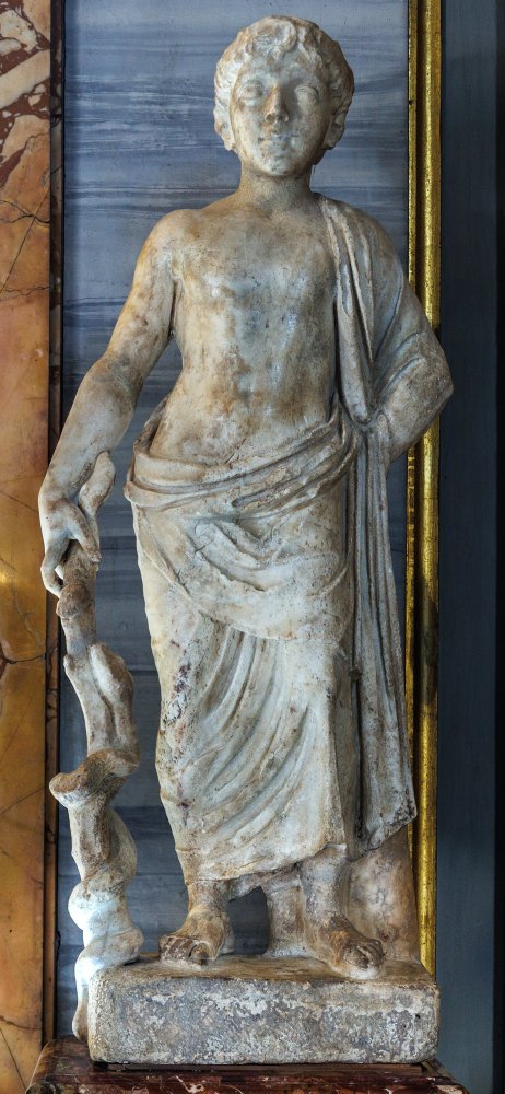 - Stehender Knabe im Mantel, Oberkörper entblößt, neben dem rechten Bein Ast mit sich hinaufwindender Schlange. Hinter dem linken Bein Stütze.