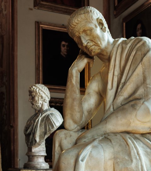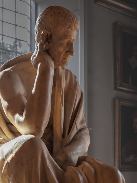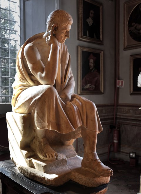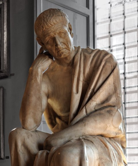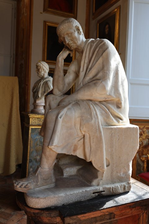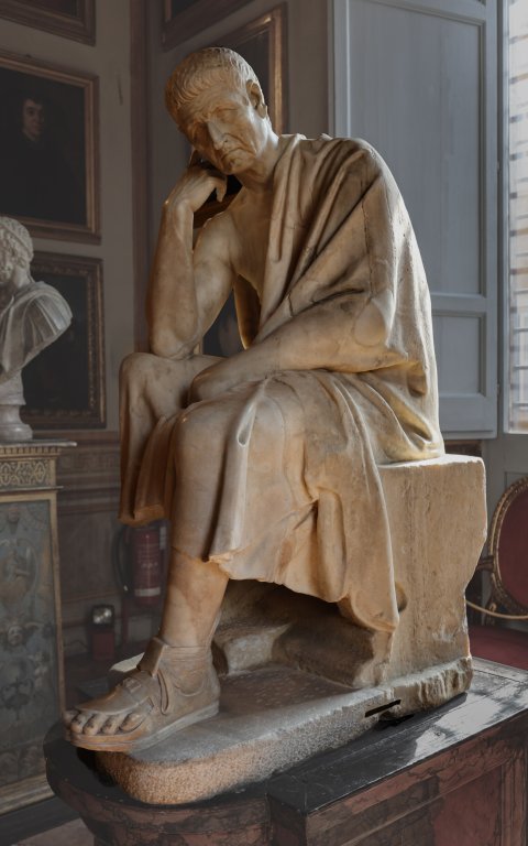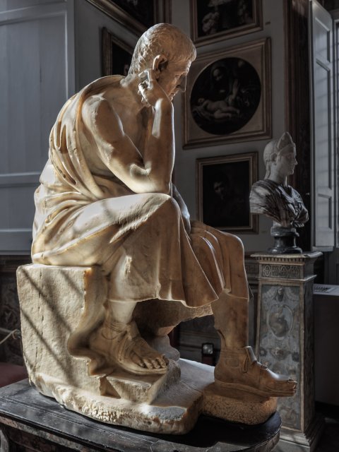 Auf lehnenlosem blockförmigen Sitz sitzender Mann in Mantel und Sandalen, Kopf auf die rechte Hand gestützt. Römische Kopie einer hellenistischen Statue um 230 v. Chr. mit spätrepublikanischem Porträtkopf.